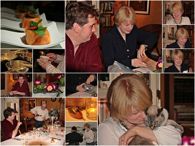 2. Our daughter Patsy’s birthday. Her birthday was on Friday and we invited her and her husband over for a little birthday dinner on Saturday. We had a lovely evening together, catching up on the latest stories in our lives, opening presents … while enjoying our food. We had three little appetizers with our aperitif, a salmon “bonbon” with crab mayonnaise as a first starter, followed by scallops. I served quails on truffle pasta in a Lapsang Souchong cream sauce as a main course. It was delicious.